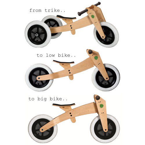 Se trata de la bicicleta de madera Wishbone 3 en 1. Es un concepto ideal para niños entre 1 y 5 años ya que es una bicicleta evolutiva y convertible. Empieza siendo un triciclo en el que el niño se apoya, va cogiendo el equilibrio y corretea, para más tarde puede adaptarse como bicicleta. Tiene 3 funciones para que según crezca el niño puedas adaptarla.