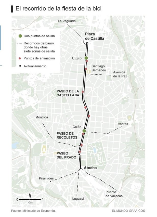 Se han organizado siete quedadas para los ciclistas desde las 09.30 de La Vaguada, Avenida de la Paz, Ventas, Puente de Vallecas, Legazpi, Pirámides y Moncloa. Estos puntos sirven como zonas de encuentro para que los participantes se acerquen al recorrido central. La comitiva ciclista ha dispuesto de un grupo de agentes de movilidad que dará prioridad a las bicicletas en detrimento de los coches, ya que en estas zonas el tráfico permanecerá abierto. Así que mucho cuidado.