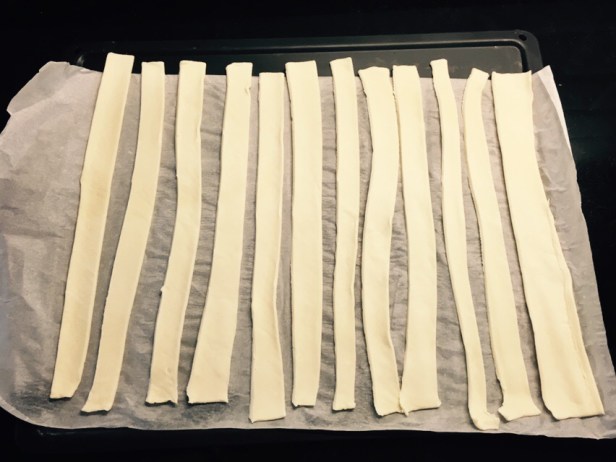 Estirar la masa de hojaldre encima de una hoja de horno y cortar en finas tiras