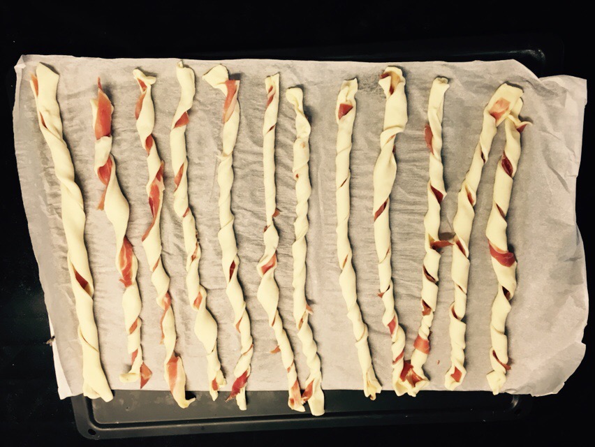 Cortar las lonchas de jamón en finas tiras e ir colocándolas encima de cada una de las tiras de hojaldre ( en esta parte pueden ayudar hasta los niños más pequeños).