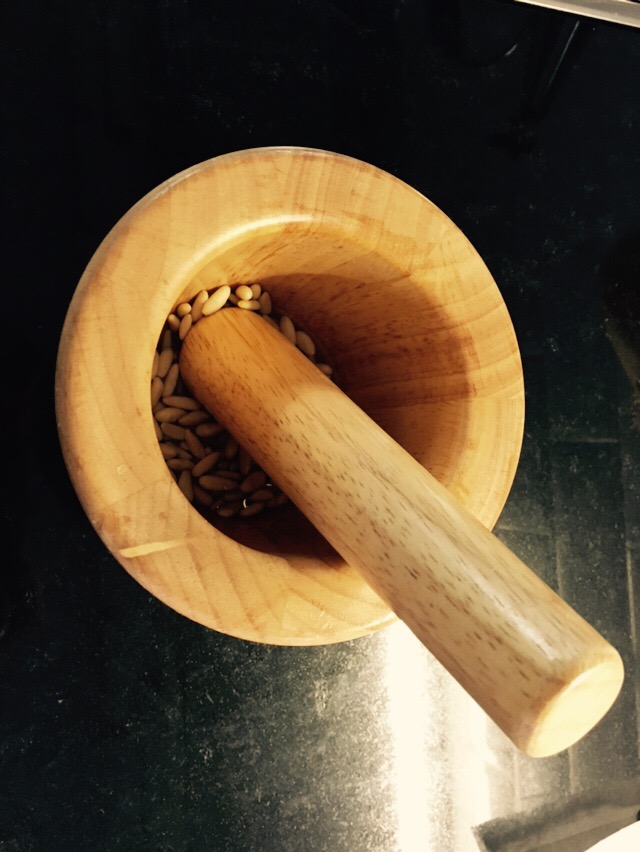 Bueno, una vez ya limpio y cocido el cardo…. Pasamos a preparar la salsa de piñones: En un mortero pon los piñones con un poco de agua para aplastarlos: