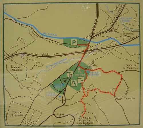 En el mapa podéis ver el punto donde dejas el coche, la ermita, la zona de Picnic y el ascenso a la silla ( andando si sigues la línea de puntos rojos y en coche, si sigues la línea negra)