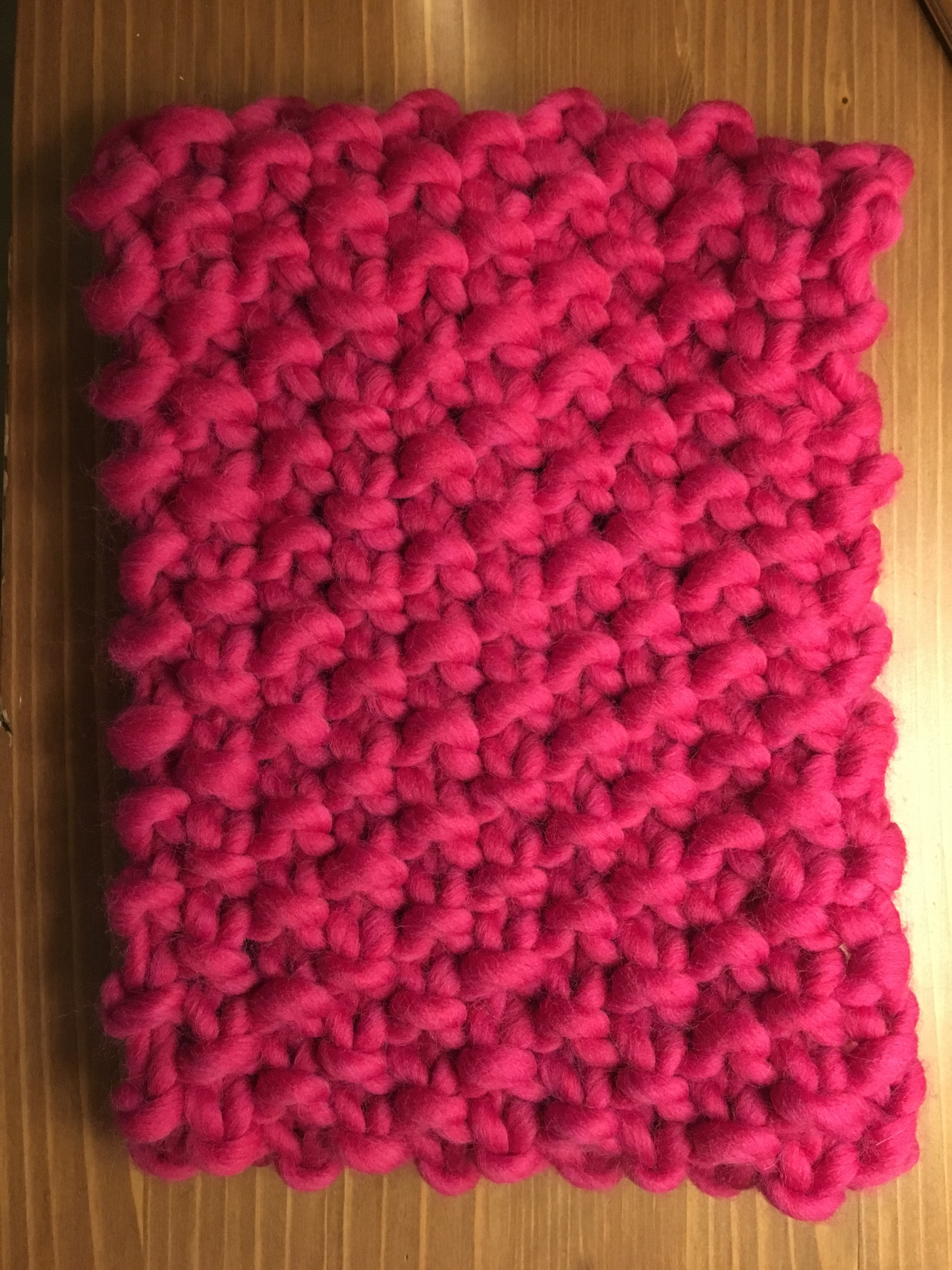 – Se teje en punto de arroz: un punto del derecho y otro del revés, uno del derecho, uno del revés… Así hasta acabar la fila (el último punto será del derecho).