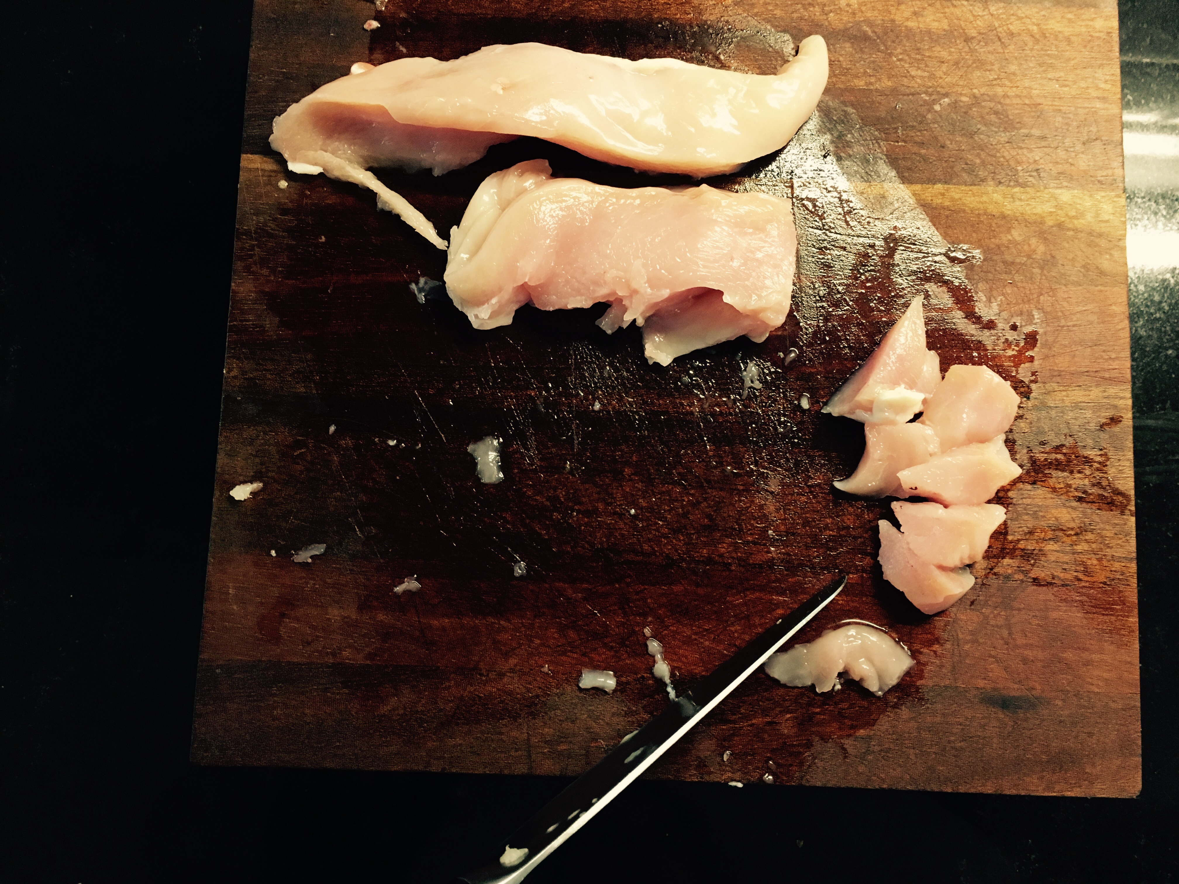 – Cortamos las pechugas de pollo en trocitos de unos 2cm