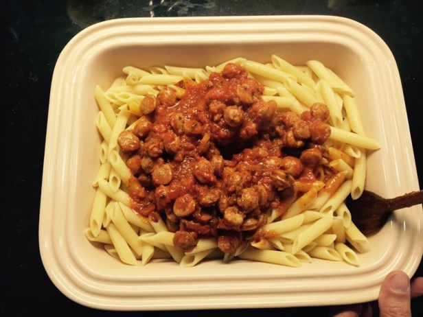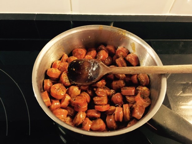 – Ponerla en una bandeja e incorporar la salsa de tomate y chorizo.