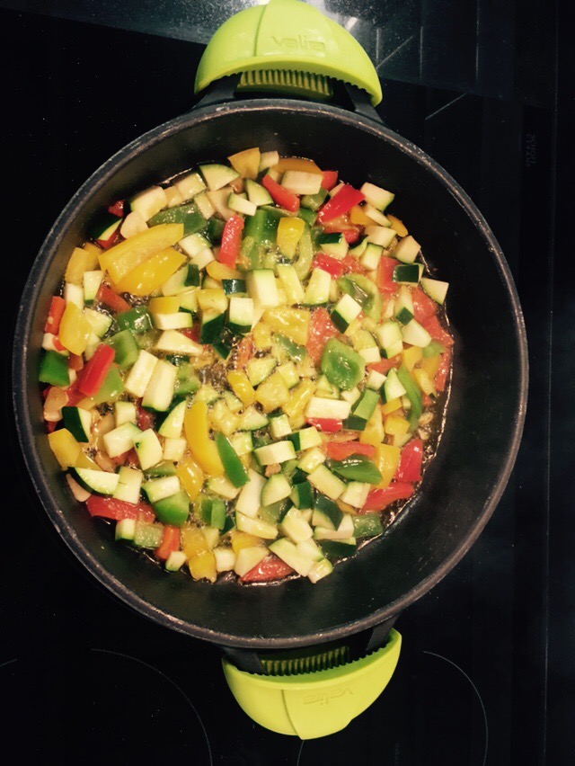 – Incorpora los pimientos y el calabacín a la cazuela.