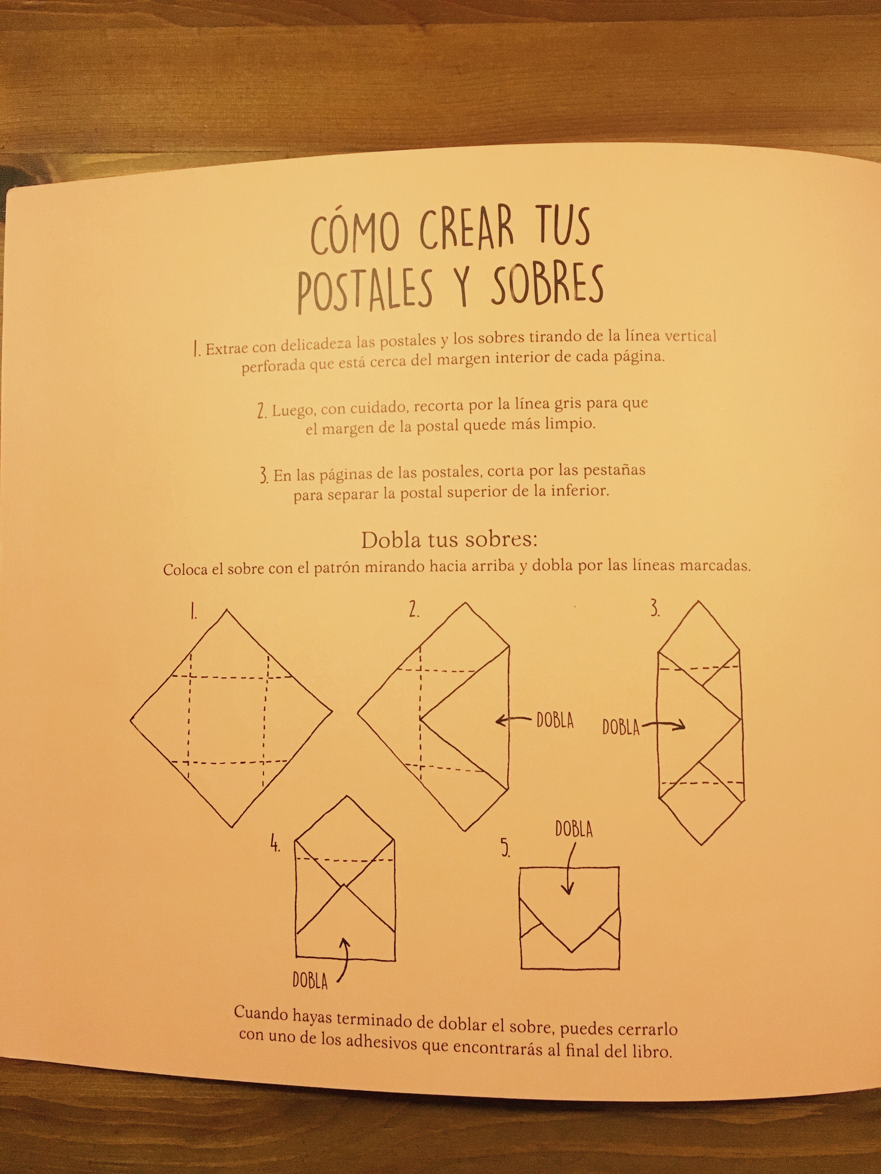 En la primera hoja del libro encontrarás las instrucciones de cómo doblar y cerrar el sobre: