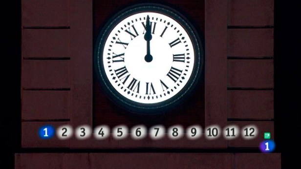 – Por último, a las doce en punto…suenan ¡las doce campanadas! Aproximadamente cada tres segundos