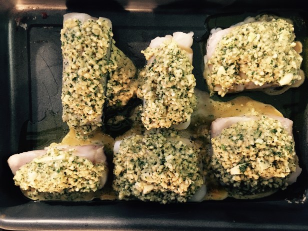 Repartir la mezcla anterior encima de cada uno de los trozos de merluza.