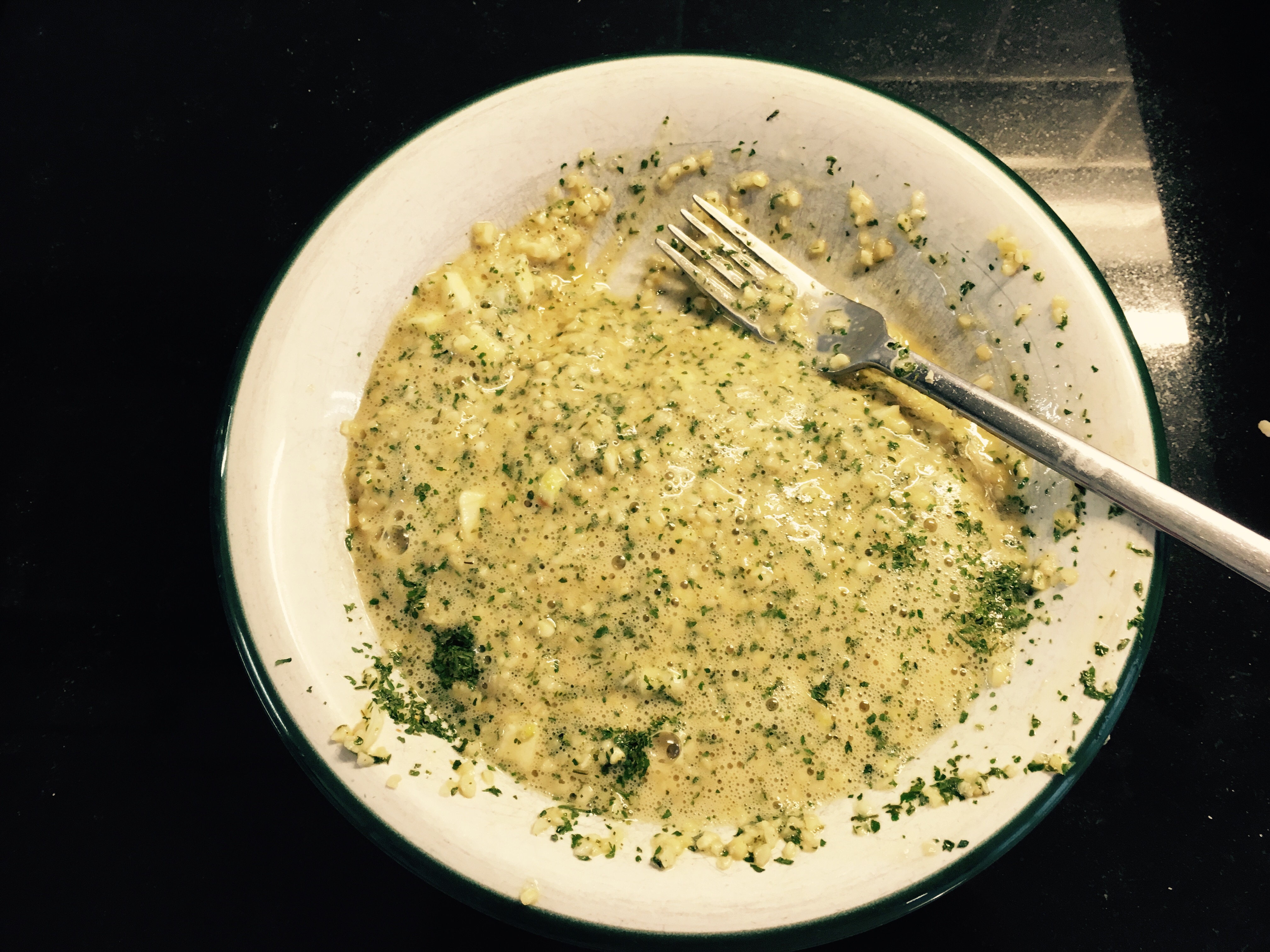 Batir el huevo y añadir el ajo picado, el perejil, el pan rallado, las almendras y una cucharada de aceite.