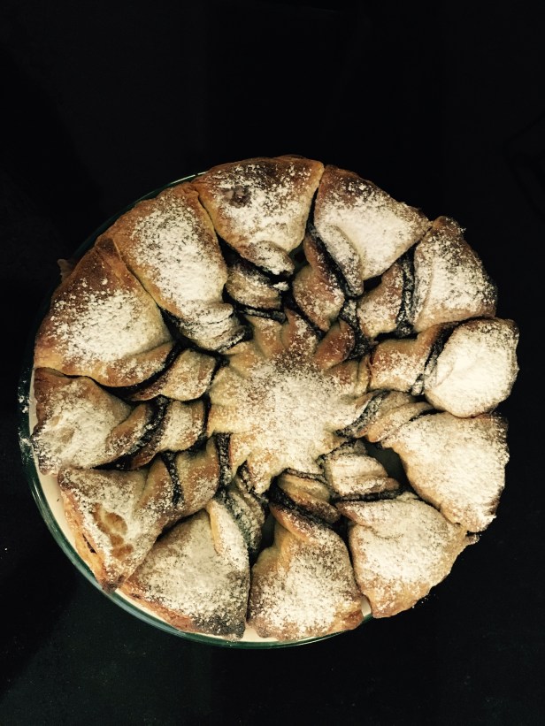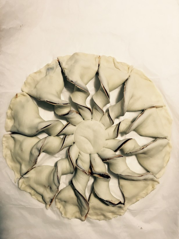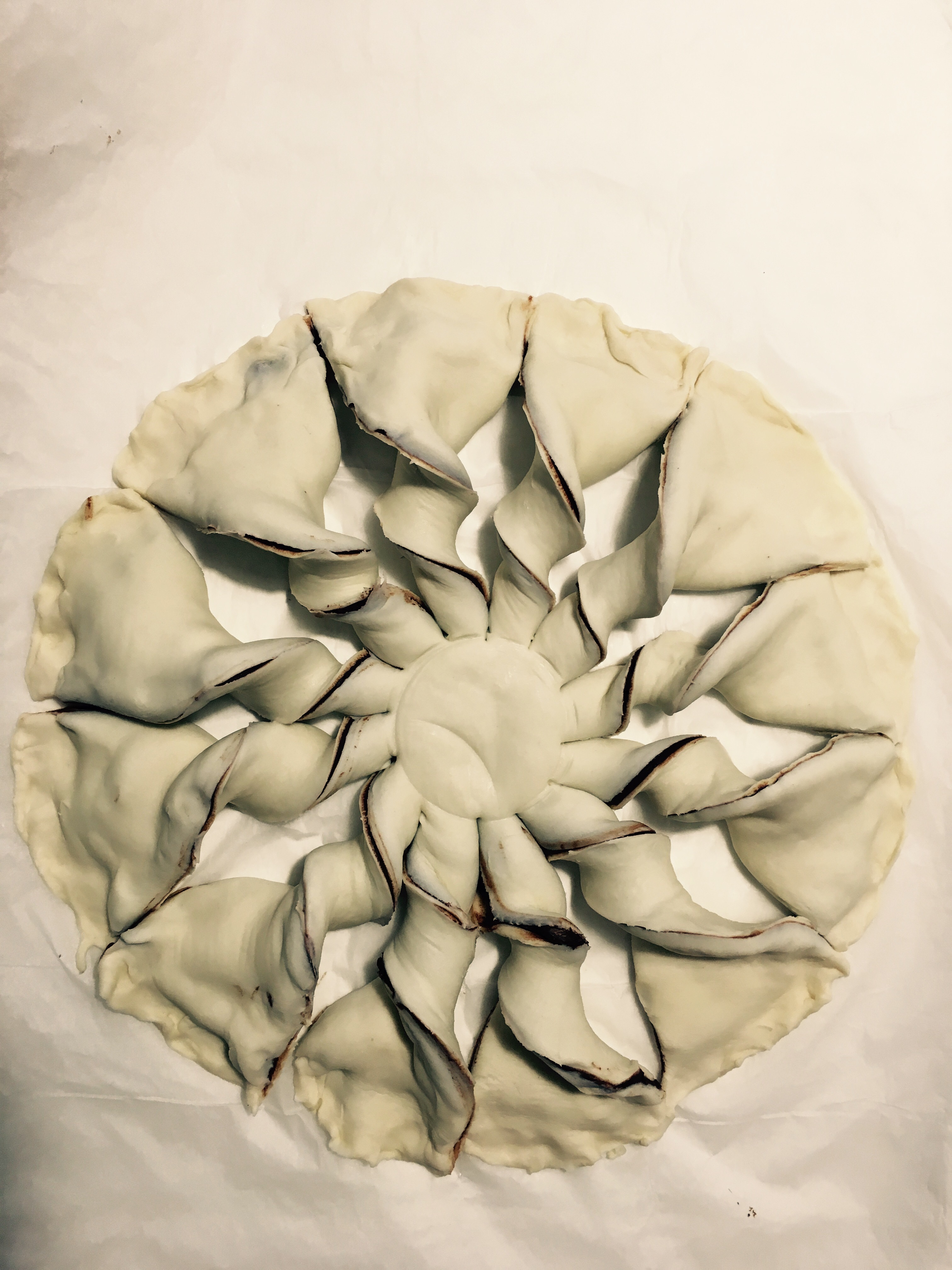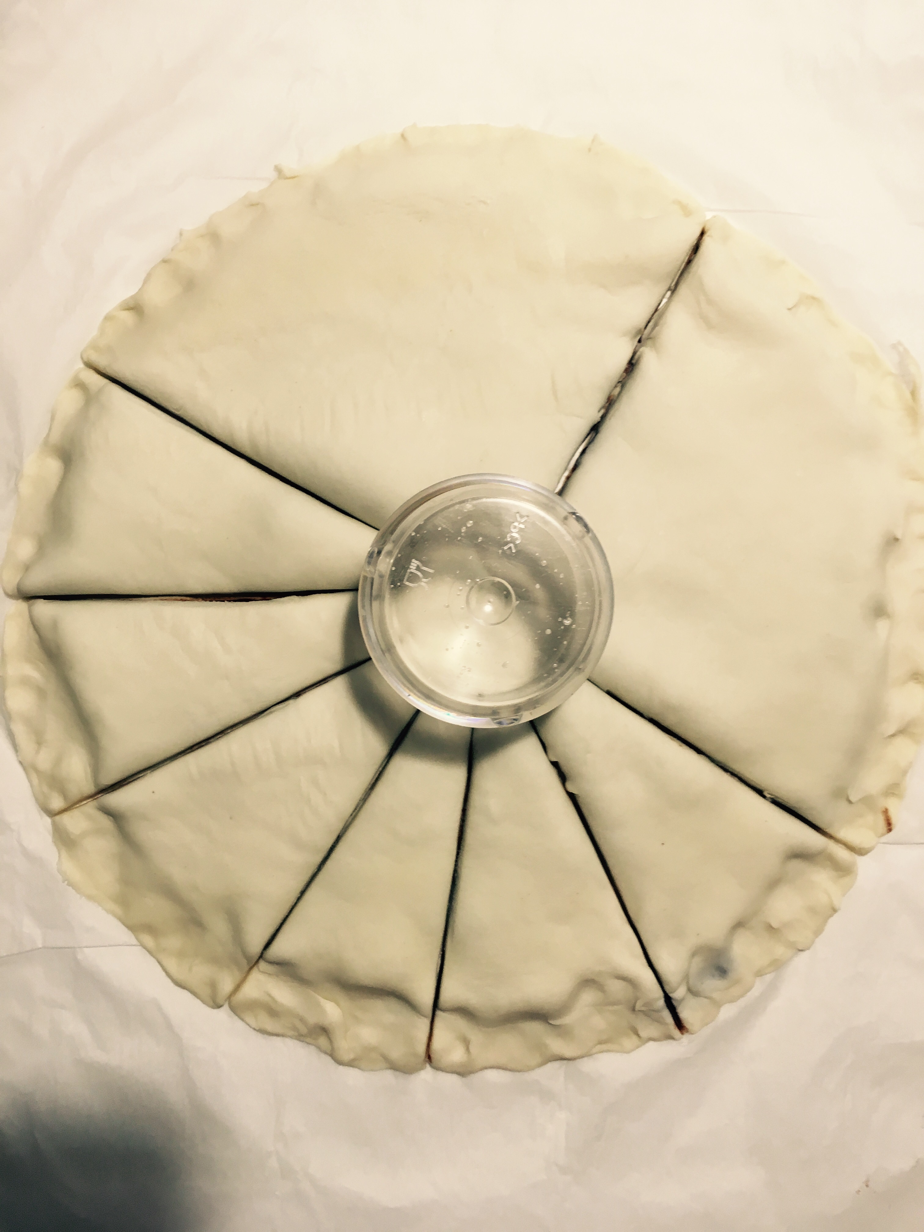 Colocar un vaso o cualquier otro recipiente tedondo en el centro y cortar la masa en 12 partes.