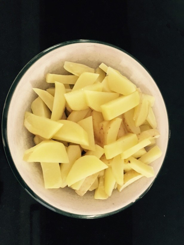 Se limpian y se cortan las patatas como si fueras hacer patatas fritas y las metes en el microondas tapadas unos 15 minutos a máxima potencia con un buen chorro de aceite.