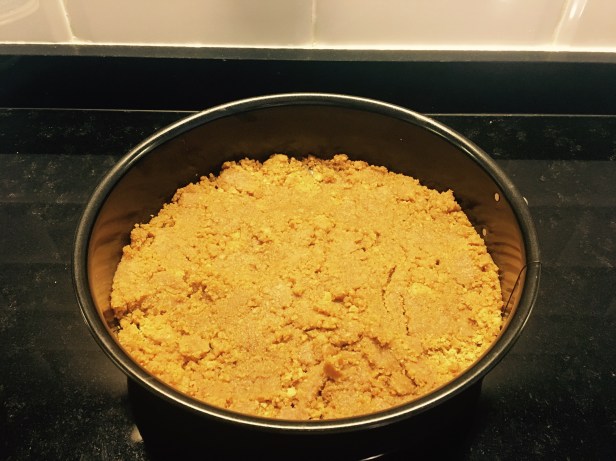 Mezclar las galletas trituradas y la mantequilla hasta conseguir una mezcla homogénea.