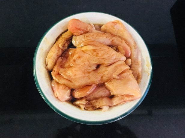 Por otro lado pon a marinar el pollo (previamente cortado en filetes gruesos) con la salsa de soja y salsa de sésamo para que coja sabor y darle un toque oriental.