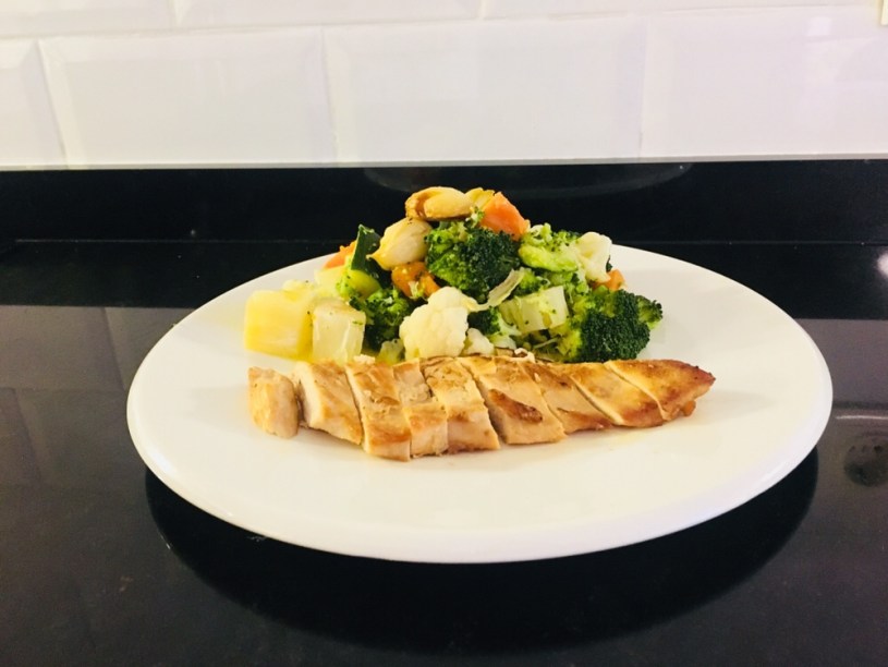 Coloca en el plato una ración de verduras aliñado con el aceite de sofreír los ajos junto con el filete de pollo.