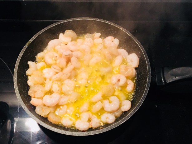 Sofríe las gambas con el fuego alto para evitar que se cuezan. Y cuando esté listo incorpora el ajo.