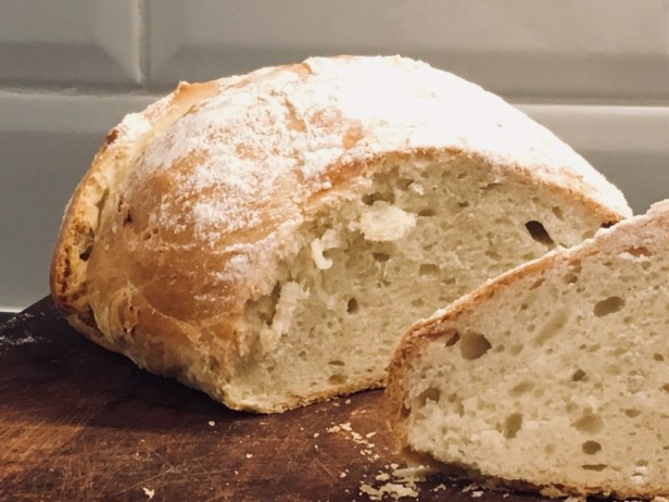 Quitar el trapo a la masa y verás como la masa se ha hinchado y esta esponjosa. Quita el aire a la amasándolo durante un par de minutos y haz dos partes (salen dos pequeñas hogazas de un palmo).