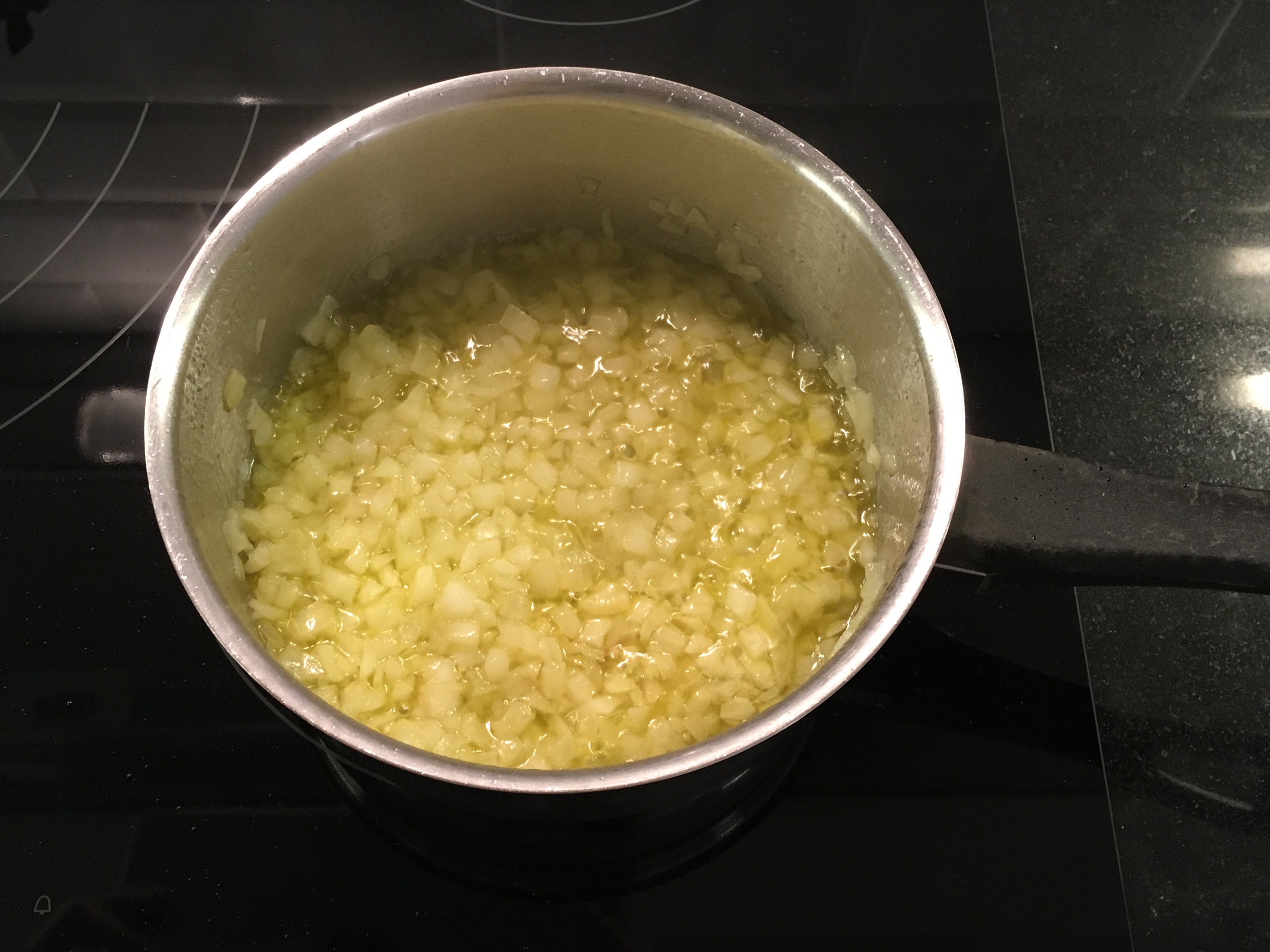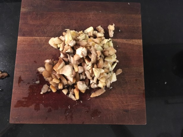 – Pochamos la cebolla y añadimos las setas y los champiñones hasta que estén Bien rehogados ( pochas durante unos 30minutos). Dejar enfriar y escurrir.