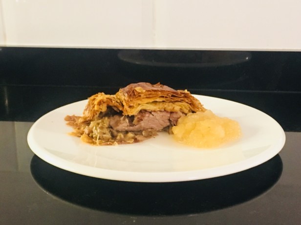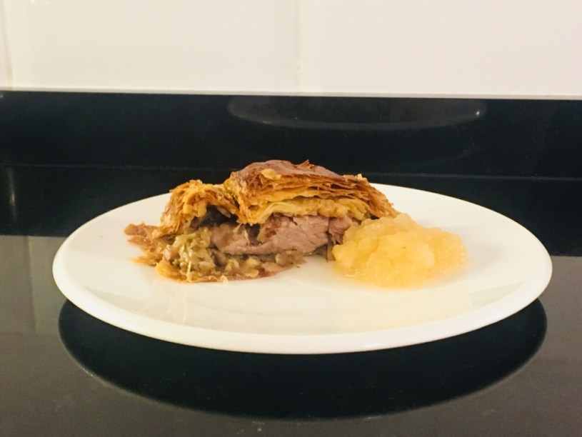 – Estiramos la plancha de hojaldre e incorporamos las setas y encima el solomillo