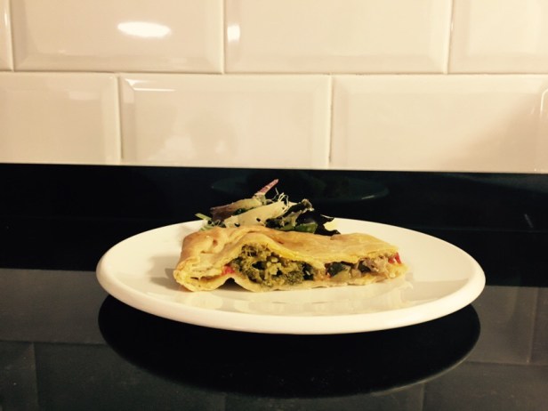 Rellena con las verduras cocinadas y cubre con la otra masa.