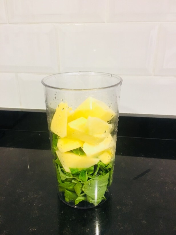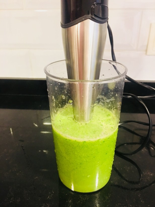 Mantener la batidora abajo para mezclar bien todos los ingredientes y subir poco a poco.