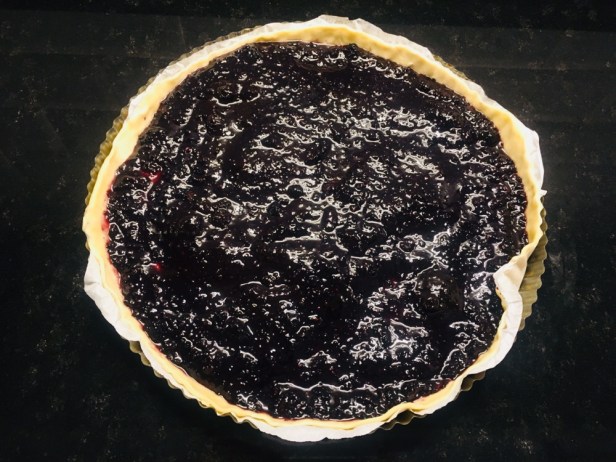 Coloca la mermelada de moras. Si esta muy espesa incorpora un poco de agua ya que cuando esté en el horno se secará un poco.
