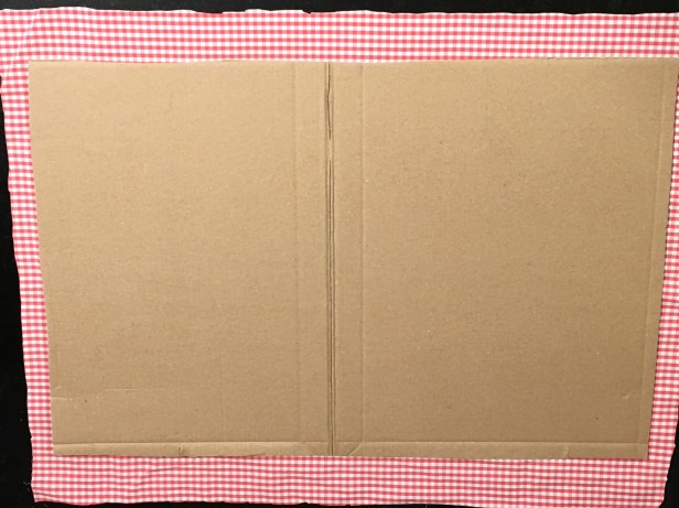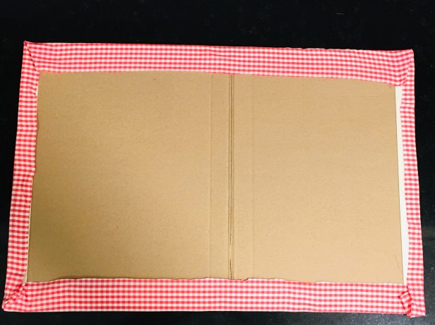 – Cortar la tela unos dos centímetros por cada lado más grande que el cartón. En esta ocasión he reciclado una camisa y he utilizado la tela de la espalda pero también puedes utilizar cualquier retal de tela que tengas por casa.