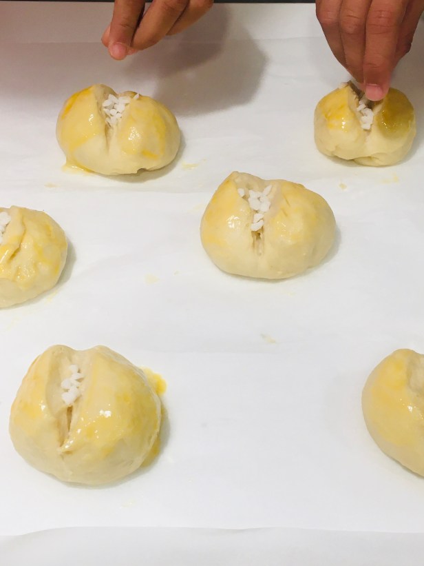 - Déjalos unos 10 minutos (mientras enciende el horno a unos 220 grados) y vuelve a pintarlos. Hazles un corte profundo con un cuchillo bien afilado y rellena el corte con azúcar húmedo.