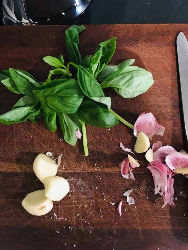 Remover e incorporar los tallos de las ramas de albahaca junto las hojas reservando las más monas para decorar al final los platos.