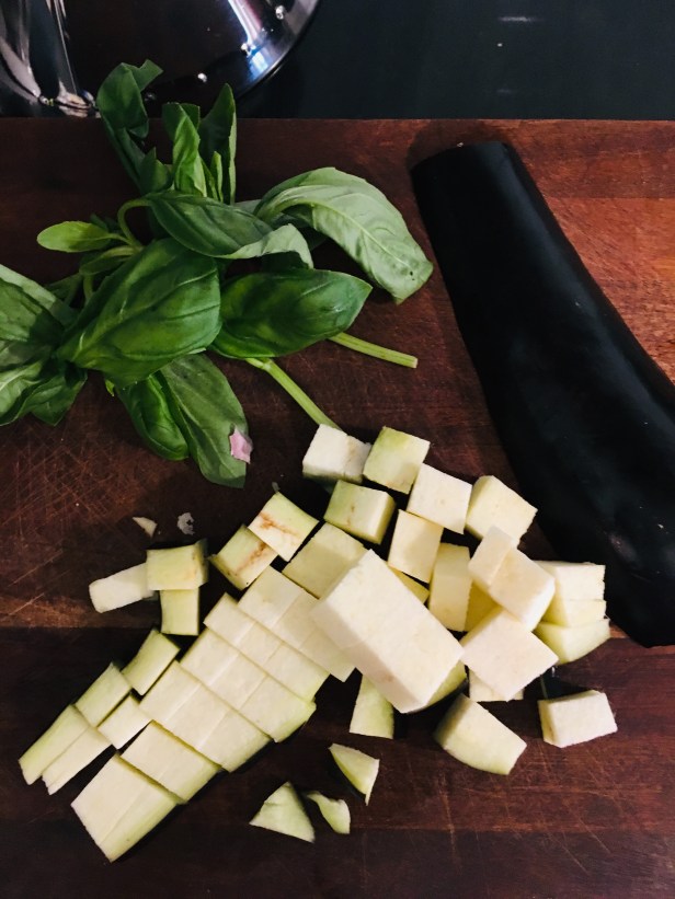 Incorporar la berenjena en dados de un centímetro, salpimentar y dejar a fuego lento para que no se pegue.