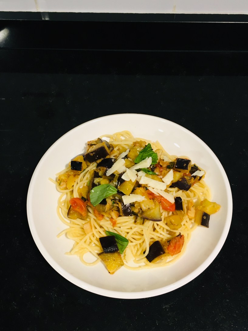 Repartir la pasta en los platos con unas cucharadas de la berenjena cocinada encima. Decora el plato con unas láminas de queso parmesano y unas hojas de albahaca.