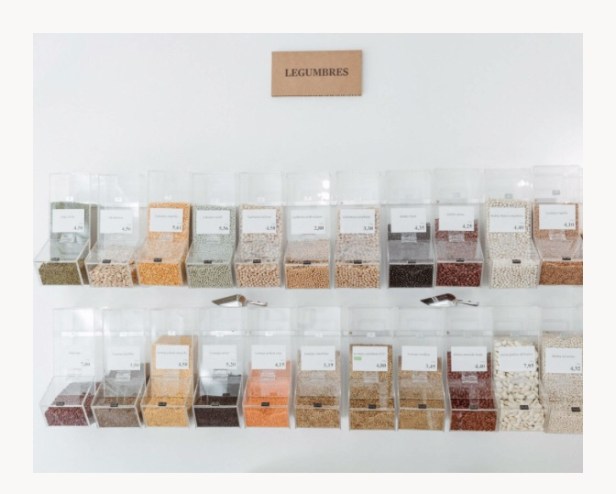 Es de las tiendas que me encantan porque no se envuelve la comida en plásticos innecesarios. La oferta es muy completa: hay varios tipos de lentejas, varios de alubias, detergente de lavadora, estropajos….