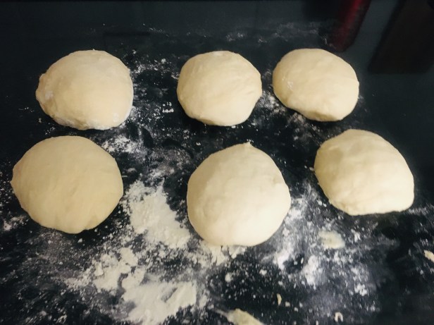 Dividir en 6 partes iguales. Amasar levemente y formar 6 bolas. Taparlas y dejar reposar unos 15 minutos.
