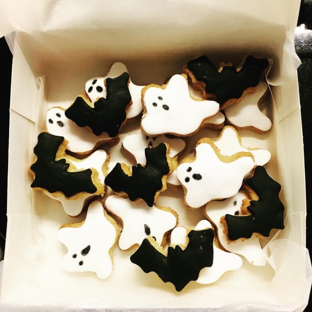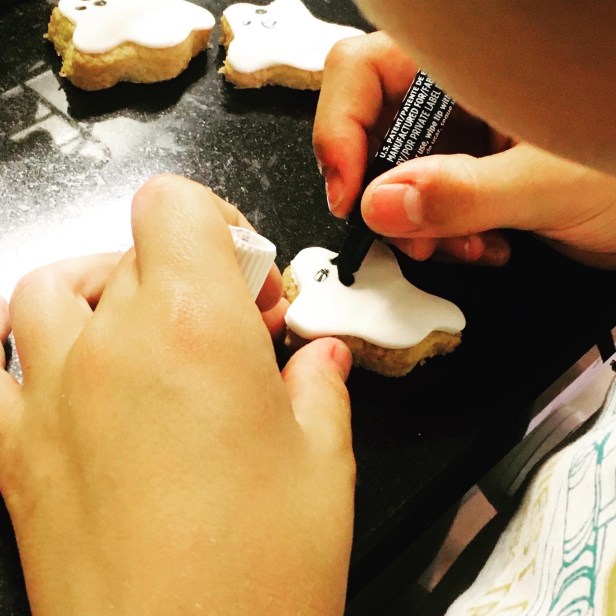 Así que el martes me puse a hacer una buena tanda de galletas mientras los peques estudiaban inglés. Galletas con forma de fantasma, murciélago y calabaza que parece son las que más éxito ha tenido los últimos años utilizando la receta de mis clásicas Galletas de coco.