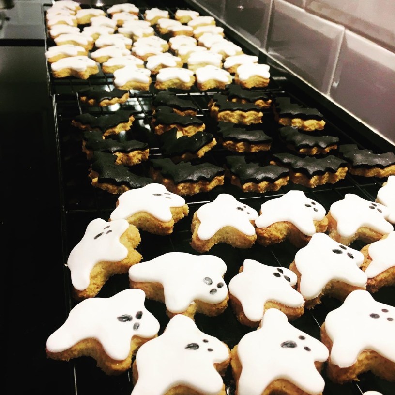 Así que el martes me puse a hacer una buena tanda de galletas mientras los peques estudiaban inglés. Galletas con forma de fantasma, murciélago y calabaza que parece son las que más éxito ha tenido los últimos años utilizando la receta de mis clásicas Galletas de coco.
