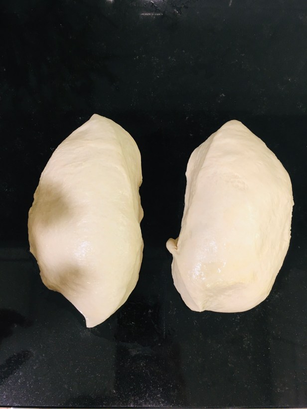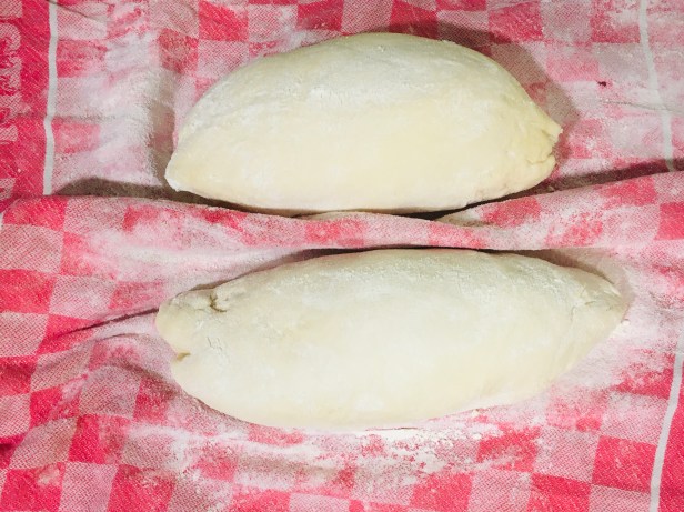 Prepara un paño y cúbrelo con harina. Coloca cada una de las partes en la mesa enharinada con la unión hacia arriba y ve plegándolos cogiendo cada uno de los bordes hacia el interior. Finalmente pliégalo por la mitad, une los bordes y haz rodar hasta dar la forma alargada de pan. Deja que suba hasta doblar su volumen.