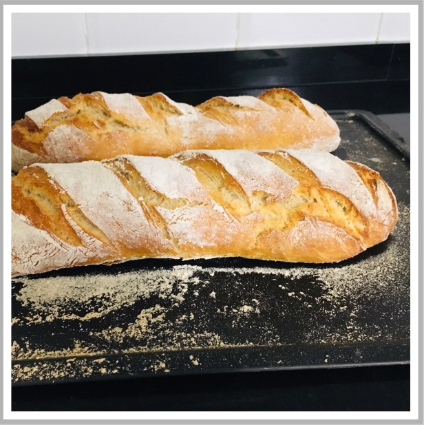 Calentar el horno a 250grados. Colocar el pan sobre una bandeja de horno enharinada. Haz 3 o 4 cortes con un cuchillo muy afilado.