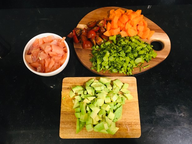 Cortar los ingredientes en trocitos similares y chiquitines para que se pueda comer cómodamente.