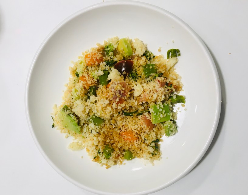 El cuscús en un tipo de pasta en bolitas pequeñitas que se cocina muy fácilmente simplemente incorporando agua alada hirviendo a la pasta y dejando reposar unos minutos. Esto la hace perfecta como base para cualquier comida si no dispones de mucho tiempo. En el súper podeis encontrarlo junto a las pastas y aunque en español se dice cuscús podéis encontrarlo bajo otras denominaciones como «cous cous» incluso cuando busquéis recetas. Como buena pasta admite tantas variaciones como se te ocurra. Aquí os dejo una de mis favoritas.