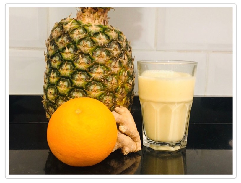 Mezclar todo hasta asegurarse que has conseguido que se haya triturado todo el jengibre. Servir y tomar inmediatamente para aprovechar todas las vitaminas