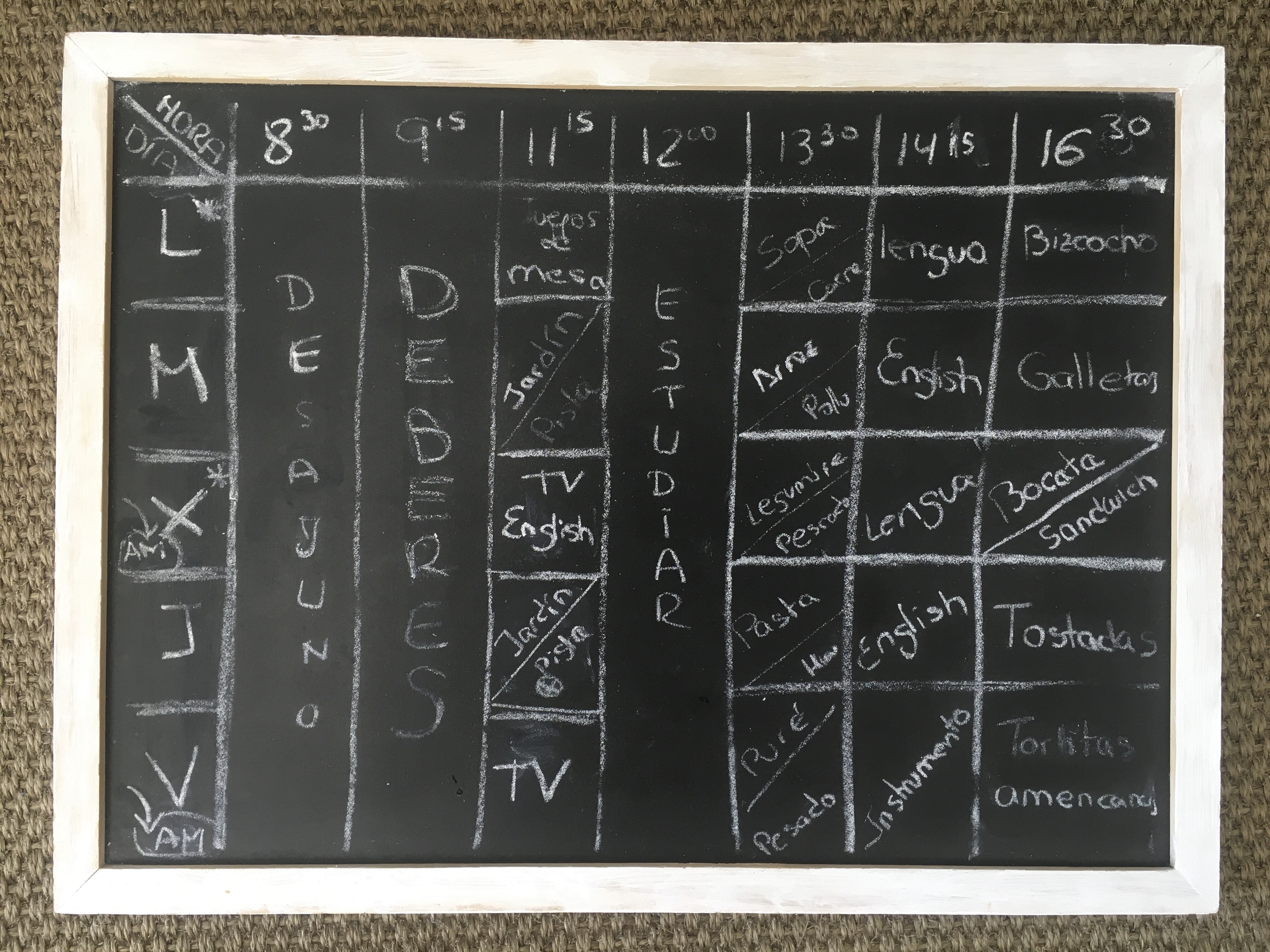 Cada mañana, de lunes a viernes seguimos ese calendario, como si un día de colegio normal se tratase, intentando cumplirlo para obligarnos a madrugar (como cualquier día de los de antes). Durante el desayuno hacemos un «briefing» para organizar las tareas concretas que cada uno tiene que hacer esa mañana y eso nos ayuda a todos a saber que hacer, ser un poco autónomos y tener nuestros momentos.