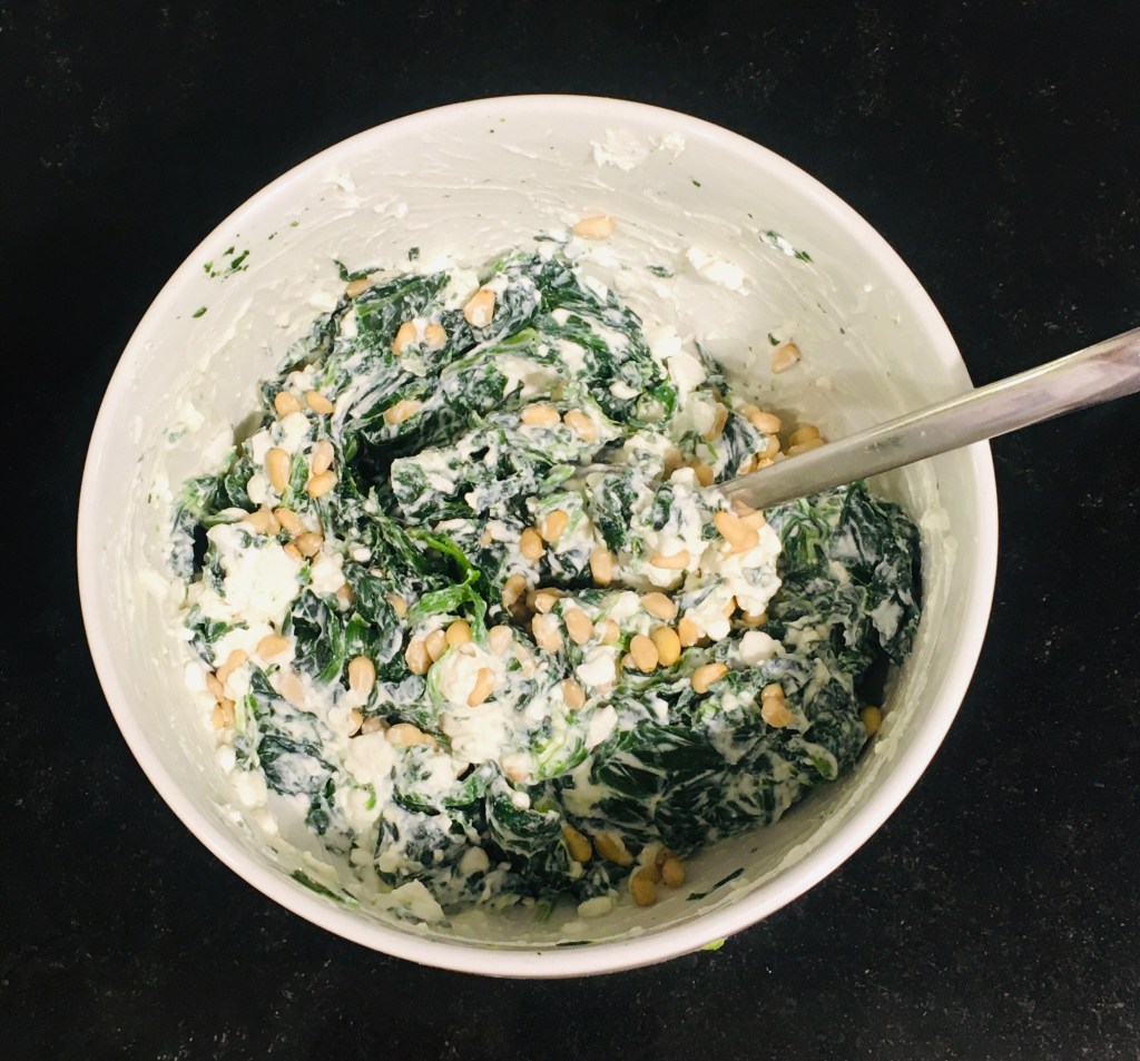 Paso 3: Preparar el relleno: mezclamos las espinacas con los distintos tipos de queso, los piñones y las espinacas. Puedes poner o bien espinacas frescas y saltearlas o congeladas.