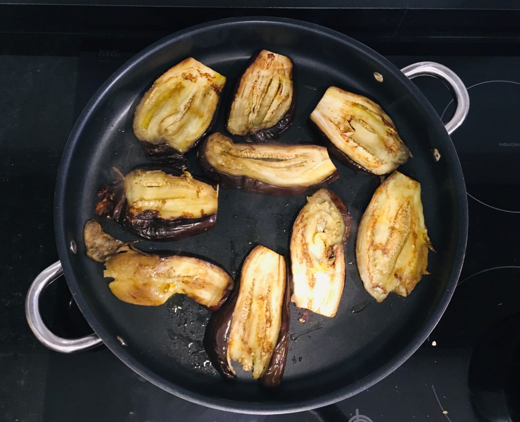 Paso 2: Asar las berenjenas. Para asar las berenjenas lo ideal es usar el horno pero dado que las temperaturas ya son suficientemente altas, en casa estamos intentando usar el horno lo mínimo e imprescindible y hemos metido un poquito las berenjenas al microondas. Luego las hemos cortado en láminas y por último las hemos salteado en una sartén para ir se acabasen de hacer y tomasen un tono doradito.