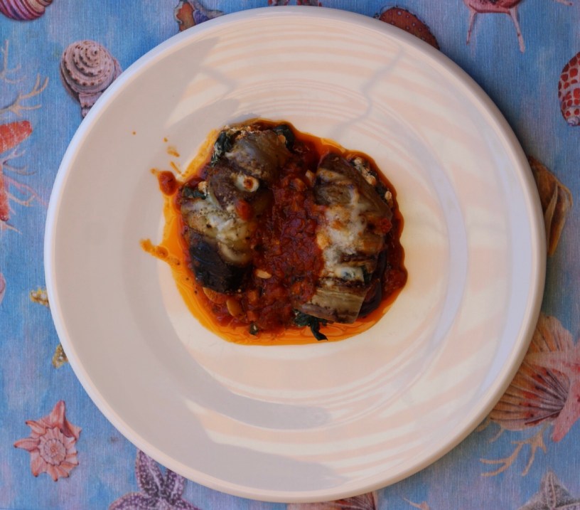 Paso 4: Rellenar las berenjenas: poner Ina cucharada de relleno en cada lámina de berenjena y enrollar. Ponerlas en una cazuela baja con la salsa de tomate, tapar y dejar durante unos minutos para que se calienten.