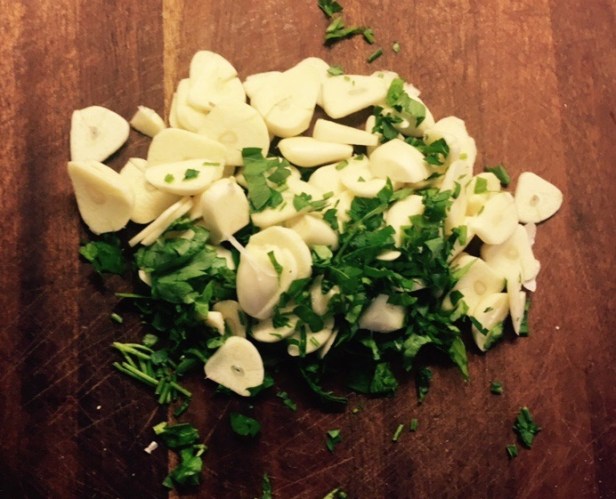 Añadir cebolla picada, ajos a láminas y perejil troceado.