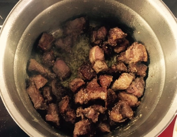 Sellar la carne en una cazuela con aceite hasta que este tostado por todos los lados.