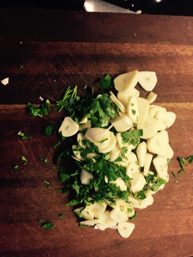 Añadir cebolla picada, ajos a láminas y perejil troceado.