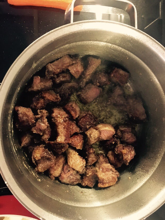 Sellar la carne en una cazuela con aceite hasta que este tostado por todos los lados.