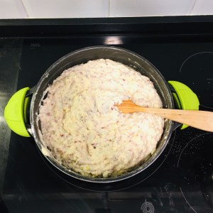 Incorporar la leche y remover durante unos 20 minutos para que se vaya cociendo la harina y vaya cogiendo textura.