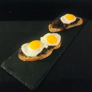Montaditos con morcilla, pimientos y huevos de codorniz (6 montaditos)